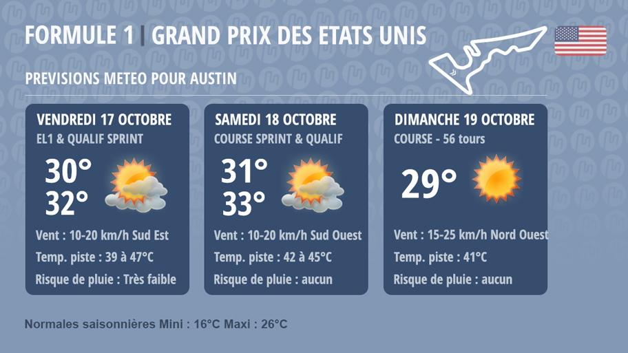 Journée ensoleillée et chaude. L’air restera sec avec un ciel peu nuageux du matin au soir. Les vents du sud à sud-est souffleront entre 10 et 20 km/h, avec des rafales à 30 km/h se renforçant en soirée. Aucune pluie prévue. Températures supérieures à la normale avec un maximum de 32°C dans l’air et jusqu’à 47°C sur la piste. La FIA a d’ailleurs placé le Grand Prix des Etats Unis avec un risque de « Chaleur élevée ». Les écuries doivent donc installer un système de refroidissement dans les monoplaces et mettre à disposition des pilotes qui le souhaitent un gilet de refroidissement. L’indice UV sera de 7 et le taux d’humidité avoisinera les 40%.