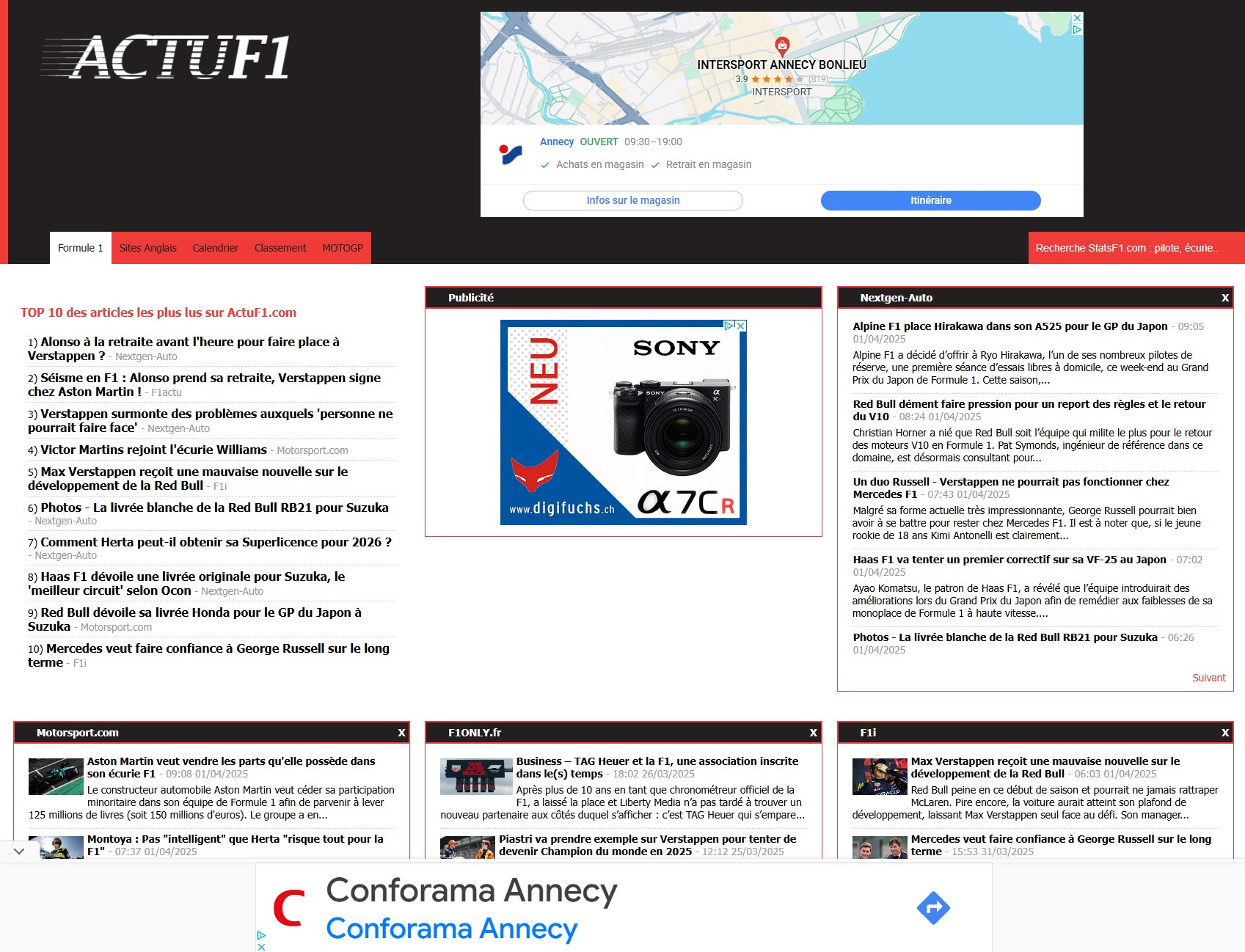 Actus-f1.com permet de suivre l’actualités des sites web français sur la Formule 1 quasiment dès leur sortie sur le site vous permettant de ne rien rater sur les actus à lire si vous êtes fan de F1.