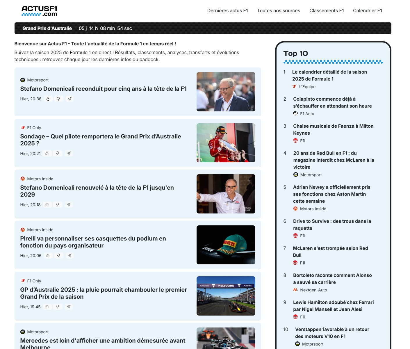 Actuf1.com agrège le contenu de plusieurs médias connus sur la F1 pour délivrer les actus les plus populaires. Simple et efficace.